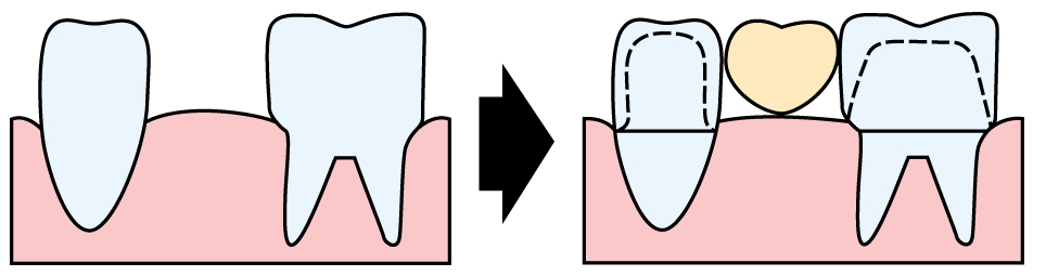 - 失ってしまった両隣の歯を削って土台にし、橋をかけるように金属の冠を固定します。道路の橋に似ていることから、この名がついています。